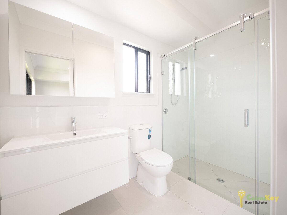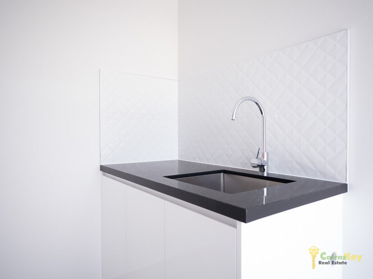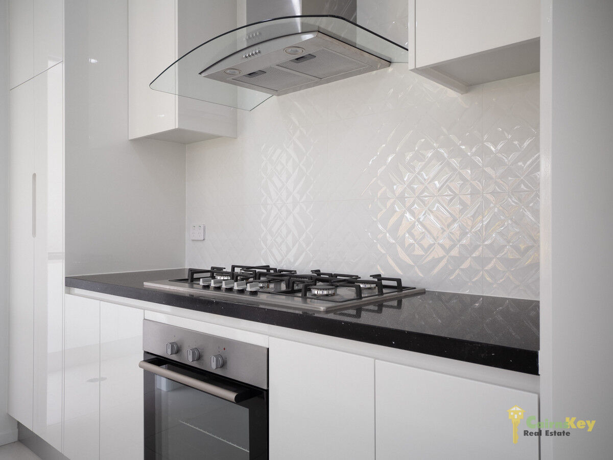 The kitchen is well equipped and functional with plenty of storage space, high gloss cabinetry, quality appliances, fixtures and fittings, black stone bench tops with striking quilt look splash back tiles. The living space opens up to the patio via the dual sliding doors to create the classic indoor/outdoor tropical lifestyle!